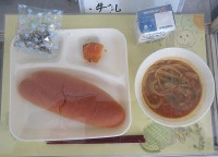 今日の献立は、カレースープスパゲッティ。かぼちゃのマリネ焼き、ミニフィッシュ、黒...