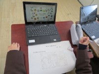 「カラフル!生きものワールド」。版画の下書きをしています。「生きもの」を入れて背景も書いてカラフルな作品になるように考えています。