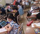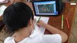 2年生の生活科で、トマトやきゅうりの観察記録を書いています。タブレットを活用して成長の様子を観察しています。