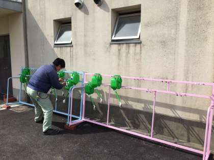 管理作業員さんが古くなって使っていなかった一輪車掛けのペンキを塗り直し、じょうろ置きとして変身させてくれました。