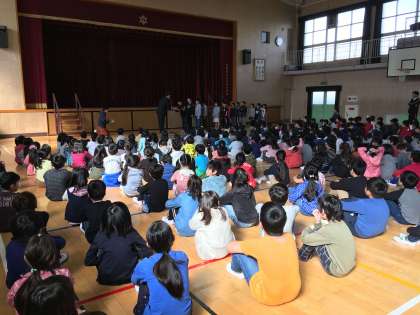 今年度初めての朝会が行われました。1年生も列に並び、校長先生のお話を聞きました。