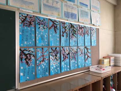 4年生の教室には、子どもが描いた桜が咲いています。鮮やかなブルーに桜色がパッと目を引きます。