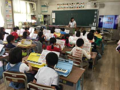 2年生は音楽で「こいぬのビンゴ」を歌いました。