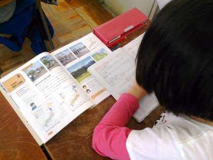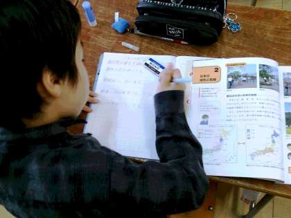 写真は、教科書で、日本の地形や気候についての調べ学習に取り組む子どもたちの様子です。5年生の社会科では、日本の地形や気候の他、日本の産業についても学習していきます。