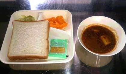 今日の給食は、ビーフシチュー、キャベツのピクルス、みかん、パン、牛乳です。