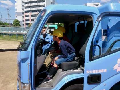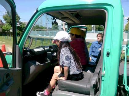 子どもたちは、実際にパッカー車に乗り、運転席からの死角についても学びました。