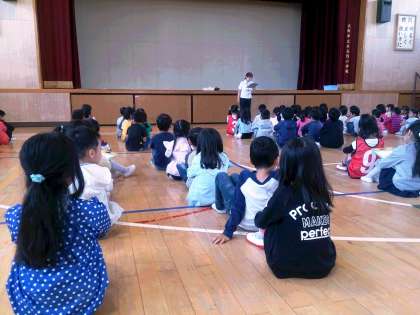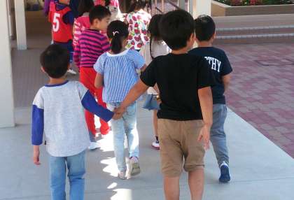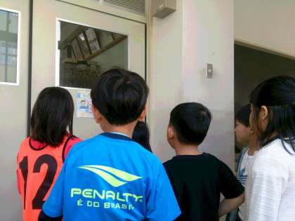 1、2年生の学校探検の様子です。先生のお話を聞き、しっかりと手をつなぎ、2年生の子どたちが1年生の子どもたちを案内しています。