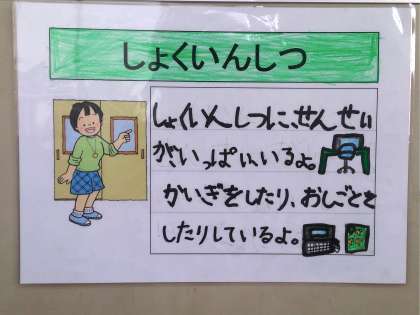 それぞれの部屋や教室に着くと、2年生の子どもたちが1年生の子どもたちへ、どんな教室かを紹介します。ちなみに、職員室は、下の写真のような紹介文になっています。1年生の子どもたちは、真剣に紹介を聞いています。