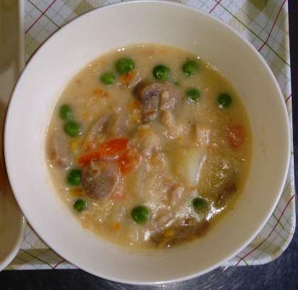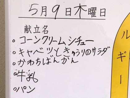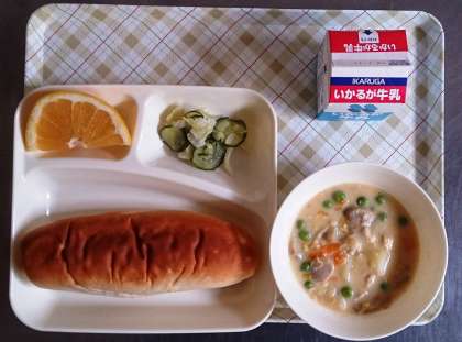 今日の給食は、コーンクリームシュー、キャベツときゅうりのサラダ、かわちばんかん、牛乳、パンです。
