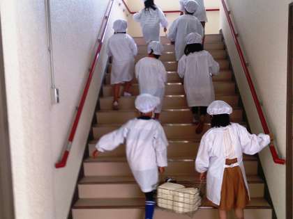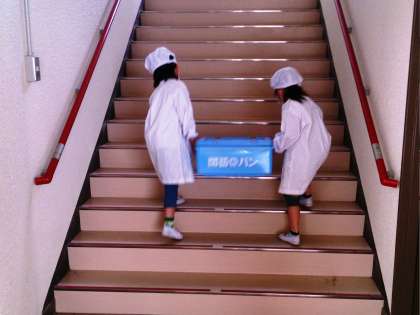 写真は、1年生が、給食を運ぶ様子です。子どもたちは、一生懸命に頑張って運んでいます。