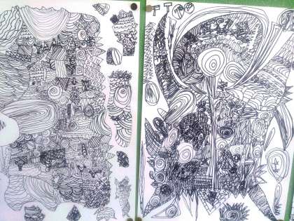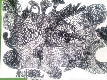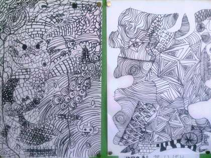 今、5年生の教室掲示に、図工「不思議な形」の作品が展示してあります。細かく緻密な描写に驚かされます。