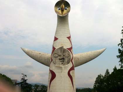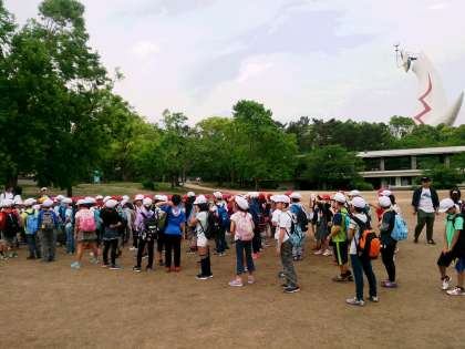 写真は、太陽の塔を横に、到着後、整列する子どもたちです。