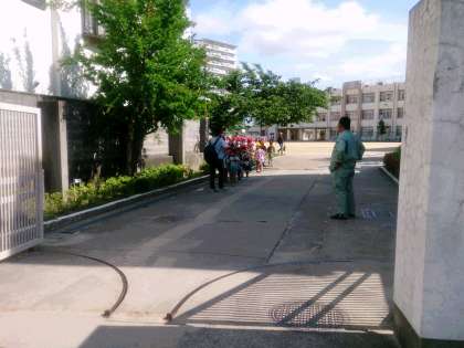 玄関で、管理作業員さんたちのお見送りの中、元気に駅に向かう1、2年生の子どもたちです。