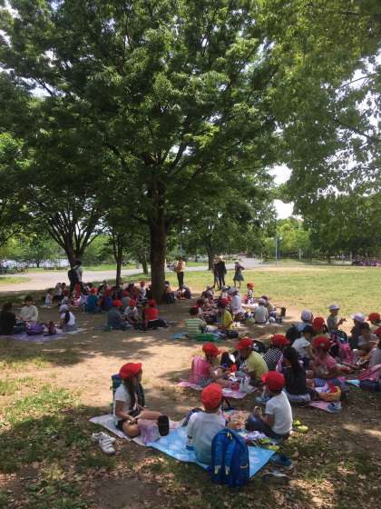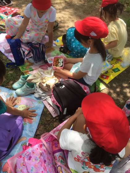 お弁当タイムです。木陰は涼しく清々しいです。みんな楽しそうに食べています。