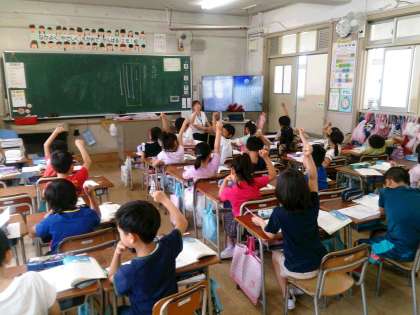 2年生の国語では、文章の読み取りをしています。カメラと液晶大型テレビを活用して,一文一文を丁寧に話し合っています。子どもたちは、積極的に手を挙げて、意見を発表しています。
