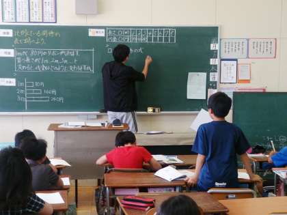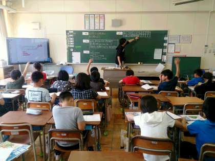 5年生は、算数で「比例」の学習に取り組みました。比例関係を表で表すことが学習の課題です。子どもたちは、積極的に発表しています。