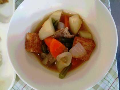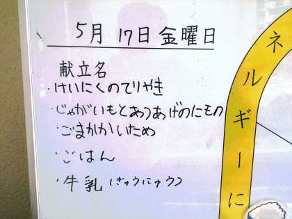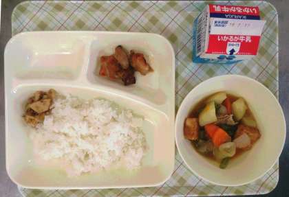 今日の給食は、鶏肉のてりやき、ジャガイモと厚揚げの煮物、ごまかかいため、ごはん、牛乳です。