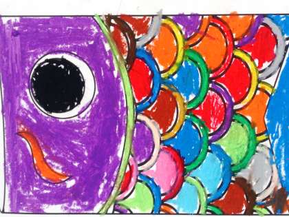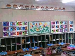 今、1年生の教室には、たくさんの色とりどりのこいのぼりが、泳いでいます。