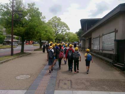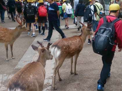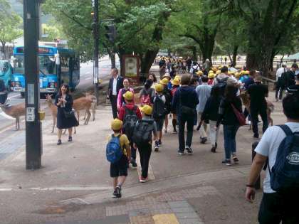奈良公園を並んで歩いています。雨はあがっている模様です。