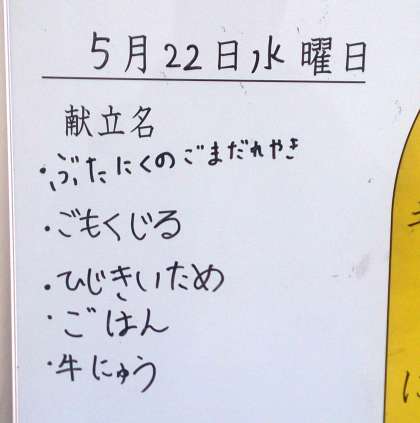 今日の給食は、豚肉のごまだれやき、五目汁、ひじき炒め、ごはん、牛乳です。