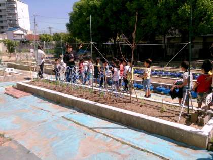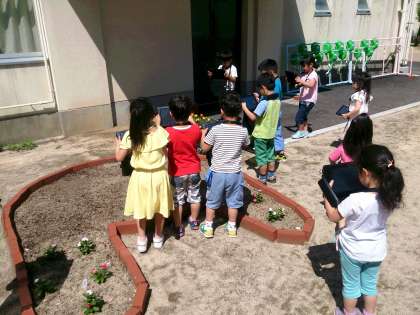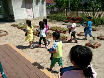 準備ができたら、いよいよ学習園、井高野ガーデンに向けて出発です。到着すると1年生の子どもたちは、草花に向かってタブレットで撮影をはじめます。
