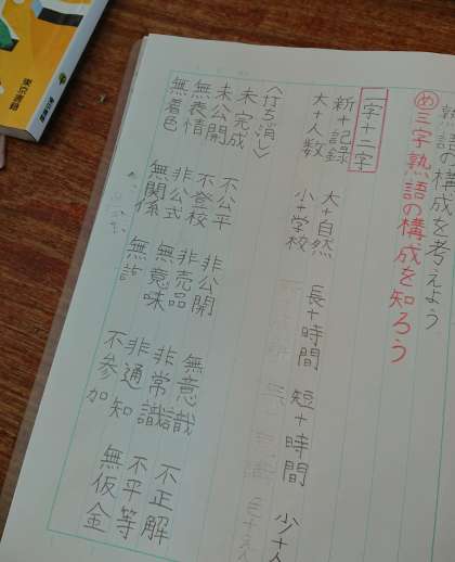 三字熟語の学習をしています。打消しの「不・無・非・未」を使った熟語をノートに書きだしていきます。とてもたくさん思いついていますね。