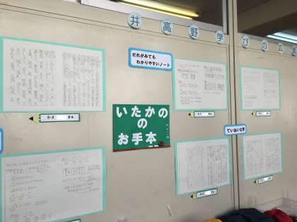 職員室の前には、「いたかのお手本ノート」ということで、高学年児童の丁寧に書かれた漢字ノートや算数ノートを掲示しています。