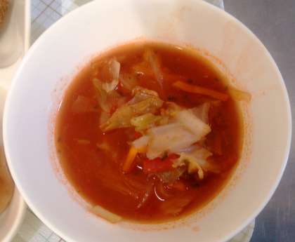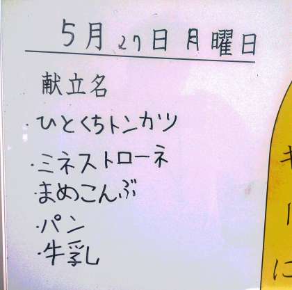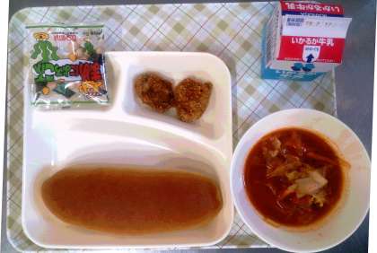 今日の給食は、一口とんかつ、ミネストローネ、豆昆布、パン、牛乳です。