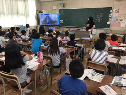 4年生は来週の庭窪浄水場の見学もふまえ、命とくらしをささえる水についての学習を行いました。ふだん使っている水がどこからどのように運ばれているかをデジタル教科書で映像を見ながら学習していました。