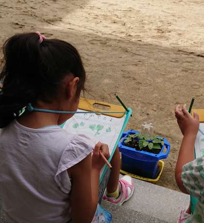 あさがおの観察をしました。芽がどんどん大きくなっていきます。これからも毎日の水やりを頑張って、きれいな花を咲かせてほしいです。