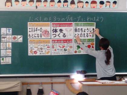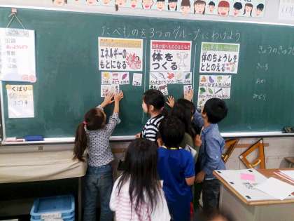 写真は、子どもたち一人ずつに配布された食べ物カードを3つのグループに分けている様子です。子どもたちは、一生懸命考えています。