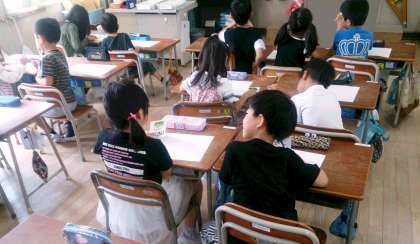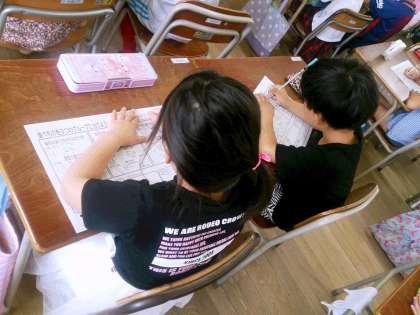 写真は、学習の中で、友だちと相談して課題を解決したり、自力解決してワークシートに記入したりしている様子です。子どもたちは、集中して学習に取り組んでいます。