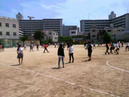 お昼休み、先生も一緒に学級遊びでドッジボールを楽しんでいます。写真は、上から6年生、4年生の学級遊び、そして、5年生がバスケットボールをしている様子です。