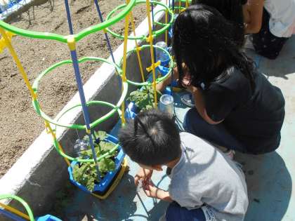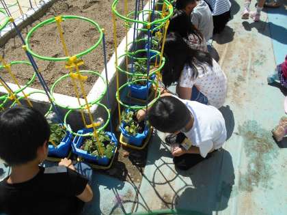 写真は、朝顔の肥料や水やりをしている1年生の子どもたちです。大きくなれと一生懸命お世話をしています。