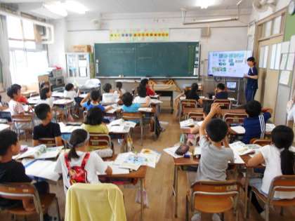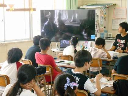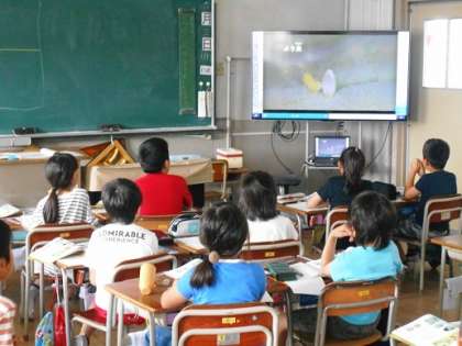 写真は、3年生の理科と6年生の社会の歴史学習で、デジタル教科書や視聴覚教材を活用している様子です。3年生は、チョウの育ち方を幼虫の様子等を動画で観察しています。6年生では、源氏と平家の時代についての歴史動画を見ています。