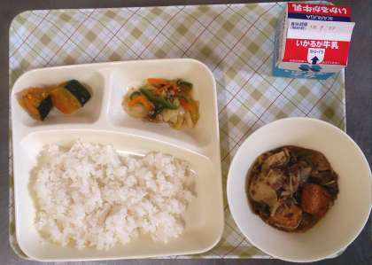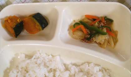 今日の給食は、すき焼き煮、焼きカボチャ、野菜のそぼろ炒め、ごはん、牛乳です。