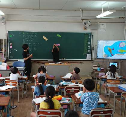 どちらが長いかくらべるためには、どうすればいいかをみんなで考えています。消しゴムを使ったり、下じきを使ったりと、アイデアを出し合っています。