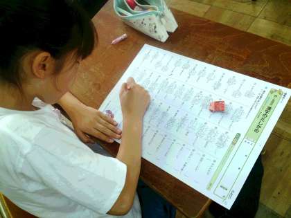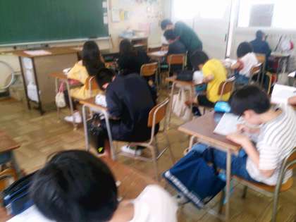 写真は、漢字のまとめのプリントに取り組んでいる子どもたちの様子です。一画一画丁寧に漢字を書いています。
