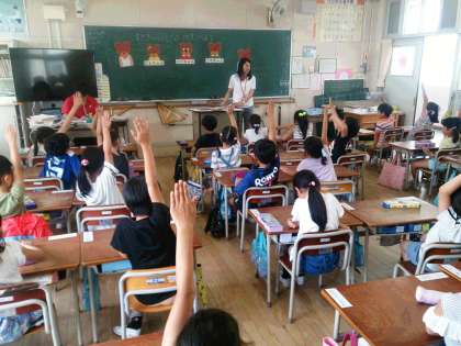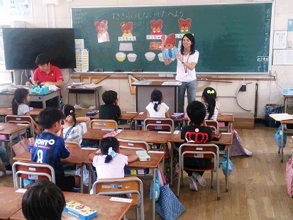 1年生が、栄養についての学習に取り組んでいます。子どもたちは、しっかりとお話を聞き、発問があると、積極的に挙手や発表をしています。