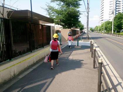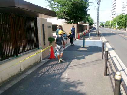 写真は、正門で、東淀川警察の見守りのもと、子どもたちが登校している様子です。パトカーも朝、巡回しています。下校時も気を付けて帰宅してほしいと思います。