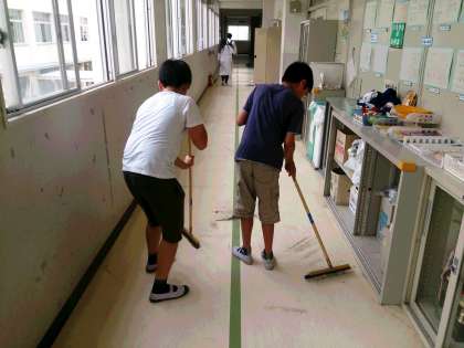 清掃の時間、職員室や校長室の廊下前の清掃を担当する6年生の子どもたちが、玄関マットの下の土やごみを丁寧に掃除していました。友だちと工夫しながら取り組む姿に感心しました。