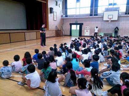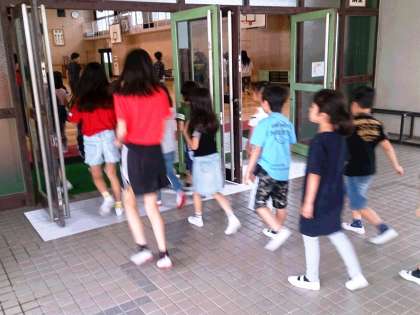 今日、不審者が侵入した時の避難訓練を行いました。子どもたちが、先生の指示に従って、安全に避難する訓練です。登下校時や友だちと遊んでいる時など、学校外での不審者の対応についても指導を行いました。子どもたちは真剣に訓練に取り組んでいました。