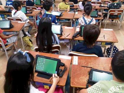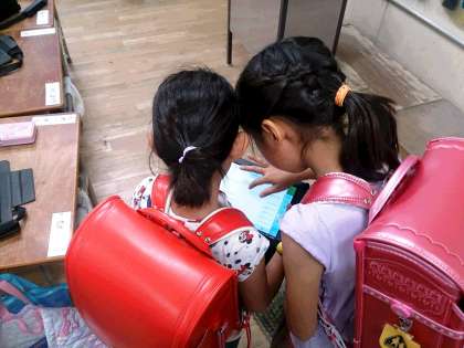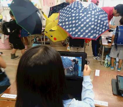 1年生の子どもたちが、タブレットを使って、ランドセルを背負い、傘をさした友だちの後ろ姿を撮影し、それを見て、描画する活動に取り組んでいます。距離を考えて撮影したり、友だちと撮影した写真を見せ合ったりして、タブレットを使いこなしています。