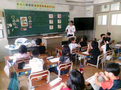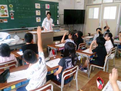 今日は、3年生の栄養指導です。「野菜を食べよう」というテーマで、野菜の栄養について考える学習です。