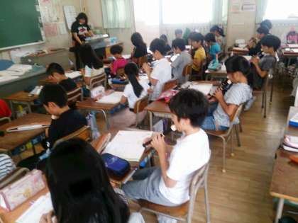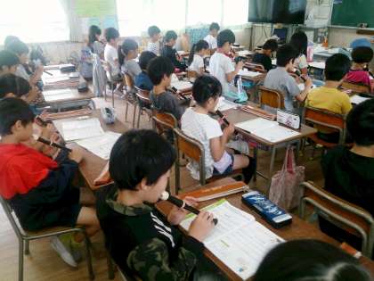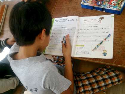 4年生は、リコーダーの学習に取り組んでいます。写真は、階名を丁寧に書き、リコーダーをきれいな音色で吹いてる様子です。
