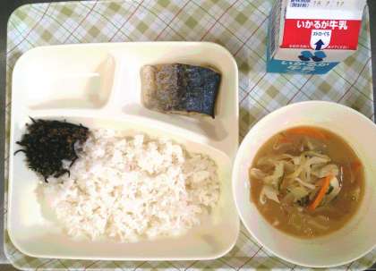 今日の給食は、さごしの塩焼き、味噌汁、ぎゅうひじきそぼろ、ごはん、牛乳です。