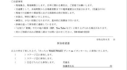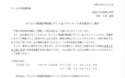 「めっちゃWAKUWAKUダンスinイオンモール参加最終のご案内」を明日、2、3年生の児童に配布します。参加をご希望されるご家庭は6月17日(月)までに参加希望書を学校に提出ください。それ以降の申し込みはお断りさせていただきますことご容赦ください。