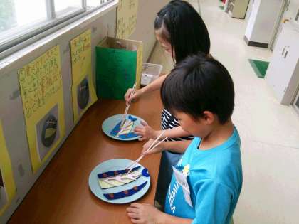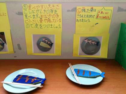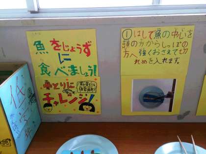 給食委員会が、「魚を上手に食べましょう」というテーマで、魚をお箸でとる練習ができる展示をクイズコーナーとともに、職員室前の廊下に作りました。とても工夫のある委員会の取り組みです。写真は、休み時間に練習している子どもたちです。