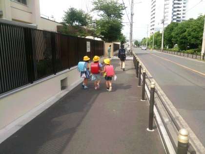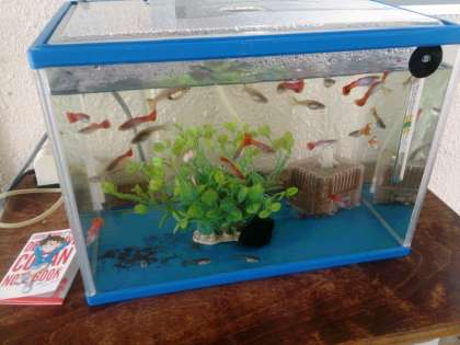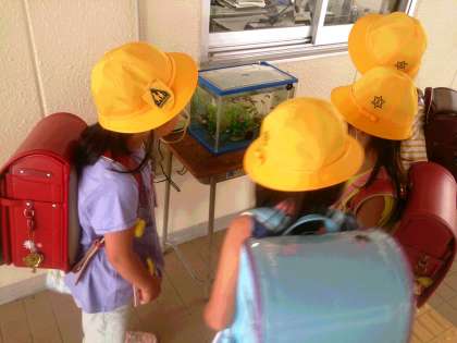 子どもたちは、今日も、しっかり挨拶して登校しています。写真は、正門を入った管理作業員室前の小さな水槽にいるグッピーを見ている子どもたちです。たくさんのグッピーが元気に泳いでいます。