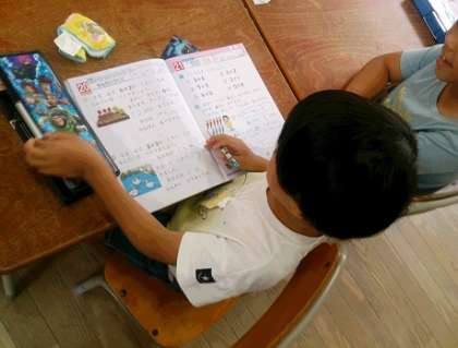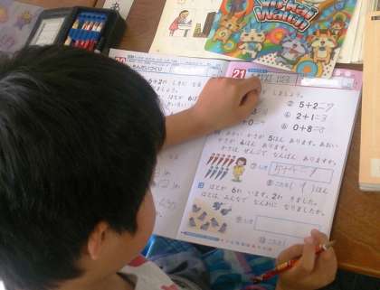 1年生は、算数で、一けたのたし算の学習に取り組んでいます。子どもたちは、集中して問題を解いています。